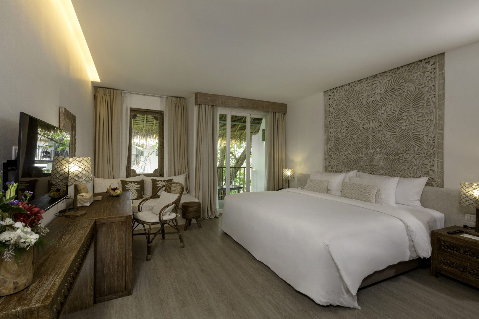 Расположение: 5 Обслуживание: 5 Чистота в номерах: 5 Цена/качество: 4 Питание: 5 Общая оценка ⭐️⭐️⭐️⭐️⭐️ с минусом Первое впечатление • Дизайнерский ресепшн с натуральными материалами, бамбуком и приятной ароматизацией. • Атмосфера «эко-спокойствия»: зелень, белочки, павлины, водоемы с карпами. • Персонал доброжелательный, заселили в 10:00 без доплат и бесплатно поздний выезд в 14:00 — редкий плюс для Таиланда. ️ Номер: Garden Tropical Villa Плюсы: • Интерьер соответствует фотографиям: натуральные материалы, большая удобная кровать, приятная палитра. • Хорошая звукоизоляция: рядом жил младенец, но плач был слышен только очень приглушённо — не мешал. • В номере уютно, приватно, тихо. Минусы: • Балкон очень маленький: помещаются только два кресла, без дополнительного пространства. • Сантехника требует обновления: душевая лейка даёт разбрызгивание, температура воды скачет. • Полотенца в номере изношены, с потертостями и небольшими дырками. • В номере был только один зонтик на двоих; позже на ресепшене зонтики закончились. Территория • Очень ухоженная, зелёная, продуманная, визуально сильная. • Водопады с эффектом “туманного пара”, пруды с карпами — красиво. • Спокойная и компактная, без суеты, подходит для отдыха. ️ Пляж Природные условия: • Широкий пляж, плотный песок, удобный заход в море — купаться комфортно. • Слева по пляжу есть простое, скромно выглядящее кафе, где еда вкусная и недорогая (лучше, чем в городе). Зона отеля: • Пляжные зонты выгоревшие и потертые. • Матрасы на шезлонгах изношены. • Пляжные полотенца — с пятнами от кремов, местами с дырками, визуально не соответствуют уровню 5. • Есть деревья, от которых тень. • Большой бассейн близко к морю. • Комфортные душ и туалеты на пляже. ️ Завтраки Один из ключевых плюсов отеля. • Большой выбор: европейские блюда, тайская кухня, свежие овощи и фрукты. • Сыры: Бри, швейцарские сорта, каперсы. • Омлет-станция, хороший кофе из кофемашин, очень вкусные круассаны. • Меню немного обновляется, завтраки не «однообразные». • Уровень завтраков действительно соответствует 5. ️ Инфраструктура рядом • Обменники, массажи, кафе — 5–7 минут пешком. • 7-Eleven — около 10 минут. • В отеле есть банкомат. Итоговая оценка Отель визуально красивый, с атмосферой, природой, отличным пляжем и хорошими завтраками. Но эксплуатация (текстиль, пляжное оснащение, технические детали) заметно не дотягивает до заявленного 5, но на это можно закрыть глаза, так как все остальное великолепно! По факту — это стильный и приятный 5 по сервису и состоянию, за исключением маленьких недочетов в виде полотенец и протекающей сантехники, которые можно простить. Добавляем в свою коллекцию любимых отелей!