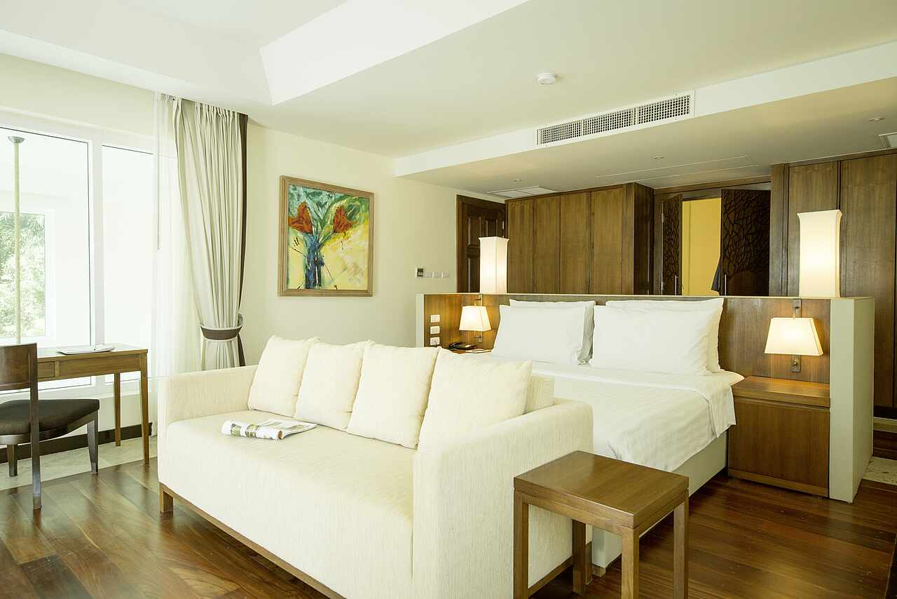 Классический номер с видом на бассейн/сад оснащен балконом/террасой, кондиционером, телевизором, сейфом, телефоном, холодильником, Wi-Fi. Гости размещаются на двуспальной кровати. В ванной комнате душ, ванна, туалетные принадлежности, фен и халаты.