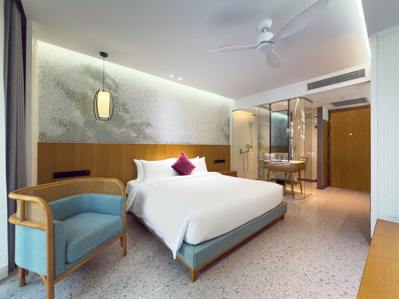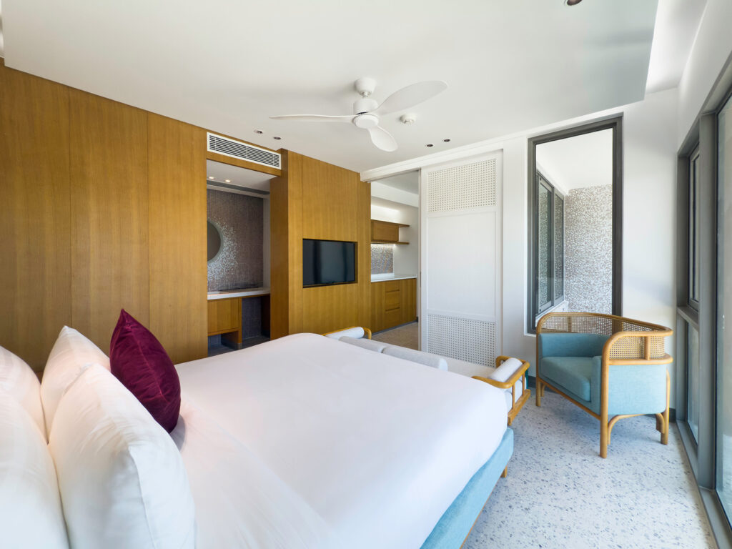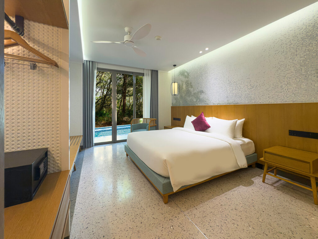Люкс оформлен в современном стиле, располагает спальней с двуспальной кроватью, гостиной зоной с диваном, ванной комнатой с душем. Среди удобств телевизор, сейф, кондиционер, Wi-Fi, телефон, набор для приготовления чая и кофе, фен, банные принадлежности. Из номера открывается вид на сад/бассейн.